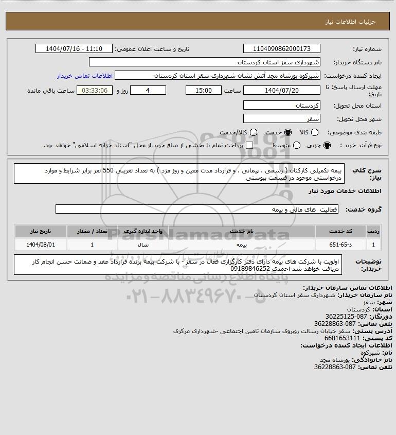توضیحات خریدار:اولویت با شرکت های بیمه دارای دفتر کارگزاری فعال در سقز - با شرکت بیمه برنده قرارداد عقد و ضمانت حسن انجام کار دریافت خواهد شد-احمدی 09189846252
