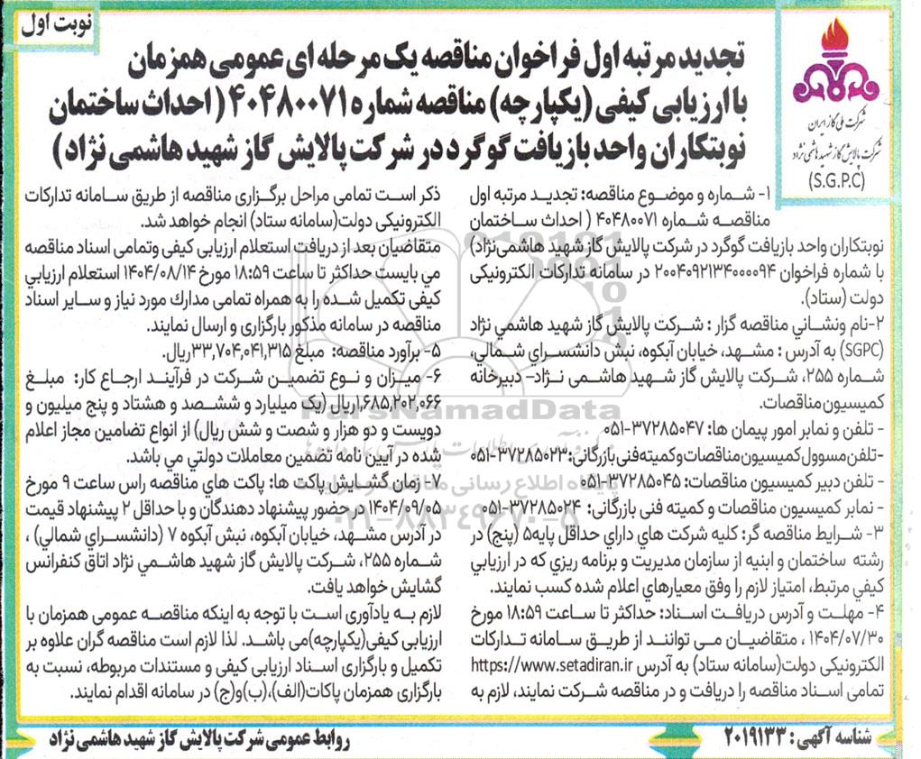 تجدید مرتبه اول فراخوان مناقصه یک مرحله ای عمومی همزمان با ارزیابی کیفی (یکپارچه) مناقصه شماره 40480071 (احداث ساختمان نوبتکاران واحد بازیافت گوگرد در شرکت پالایش گاز شهید هاشمی نژاد) نوبت اول