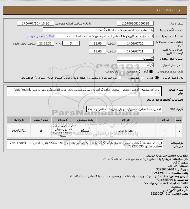 شرح کلی نیاز: ایران کد مشابه -گارانتی تعویض - تحویل رایگان گرگان-با تایید کارشناس بانک-خرید 15دستگاه تلفن داخلی Voip Yealink T30
