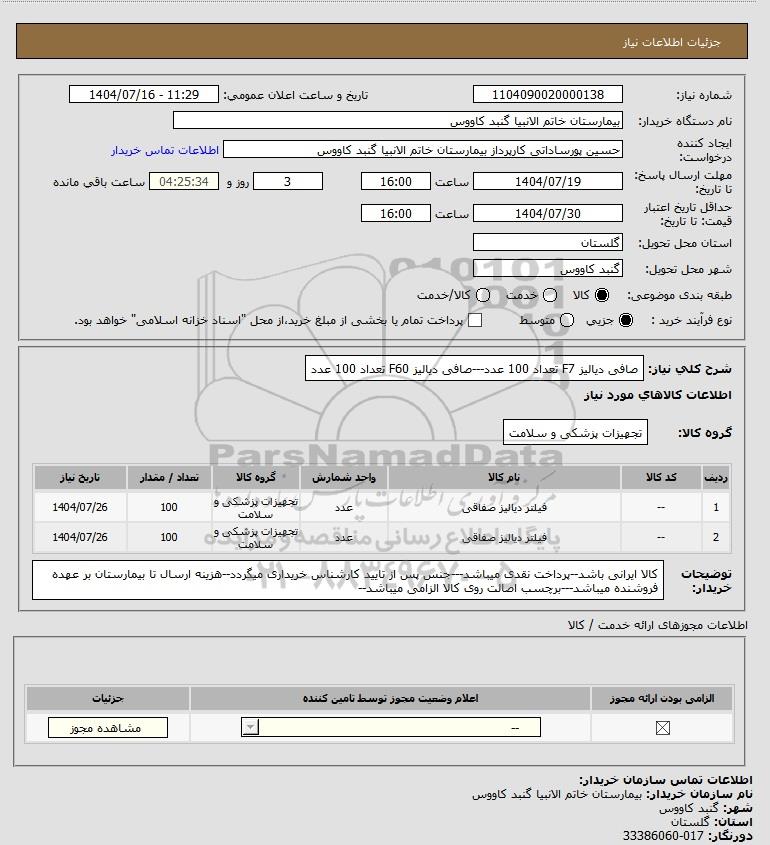 شرح کلی نیاز: صافی دیالیز F7 تعداد 100 عدد---صافی دیالیز F60 تعداد 100 عدد