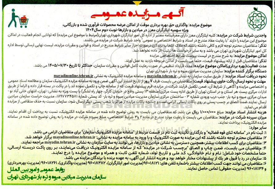 موضوع مزایده: واگذاری حق بهره برداری موقت از اماکن عرضه محصولات فرآوری شده و بازرگانی ویژه سهمیه ایثارگران معزز در میادین و بازارها نوبت دوم سال 1404