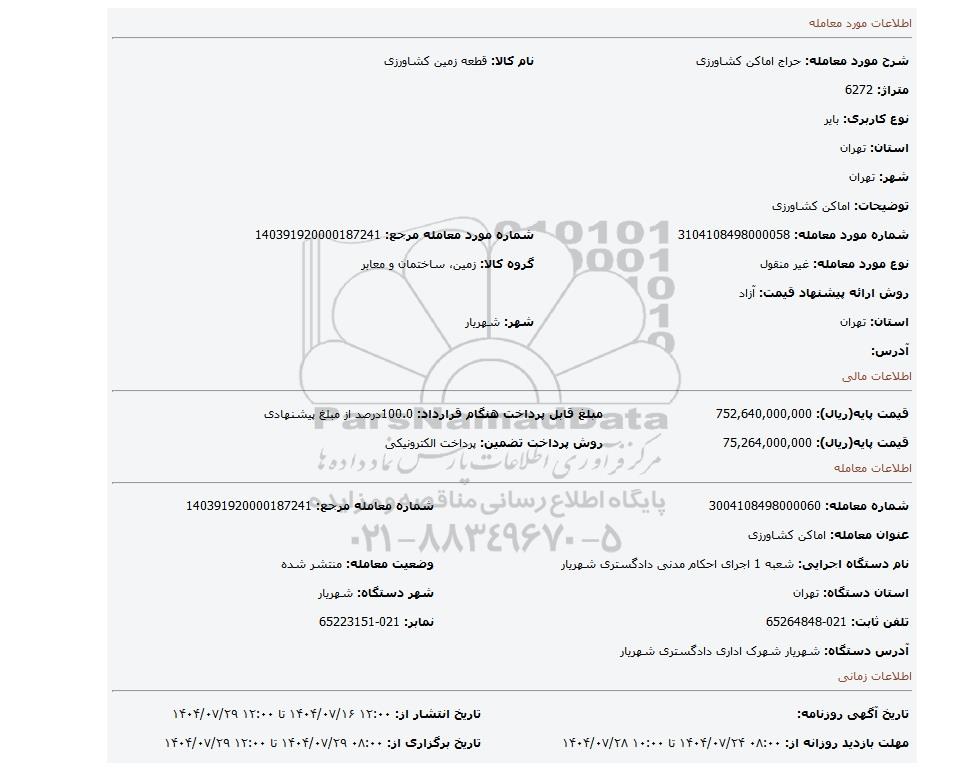 | شرح مورد معامله: حراج اماکن کشاورزی | نام کالا: قطعه زمین کشاورزی | |