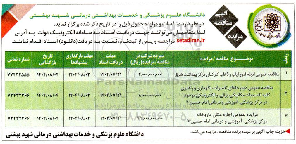 دانشگاه علوم پزشکی و خدمات بهداشتی درمانی شهید بهشتی در نظر دارد مناقصات و مزایده جدول ذیل را در تاریخ ذکر شده برگزار نماید.