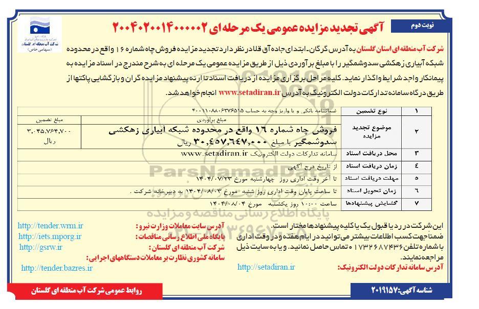 شرکت آب منطقه ای استان گلستان به آدرس گرگان - ابتدای جاده آق قلا در نظر دارد مزایده فروش چاه شماره 16 واقع در محدوده شبکه آبیاری زهکشی سدوشمگیر را با مبلغ برآوردی ذیل از طریق مزایده عمومی یک مرحله ای به شرح مندرج در اسناد مزایده به پیمانکار واجد شرایط واگذار نماید کلیه مراحل برگزاری مزایده از دریافت اسناد تا ارئه پیشنهاد مزایده گران و بازگشایی پاکتها از طریق درگاه سامانه تدارکات دولت الکترونیک ستاد ایران انجام خواهد شد.