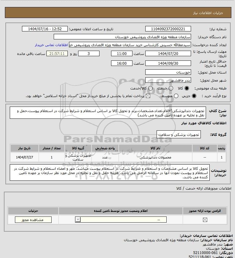 شرح کلی نیاز: تجهیزات دندانپزشکی(اقلام،تعداد،مشخصات،برند و تحویل کالا بر اساس استعلام و شرایط شرکت در استعلام پیوست.حمل و نقل و تخلیه بر عهده تامین کننده می باشد)