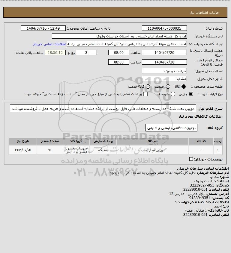 شرح کلی نیاز: دوربین تحت شبکه مداربسته و متعلقات طبق فایل پیوست از ایرانکد مشابه استفاده شده و هزینه حمل با فروشنده میباشد