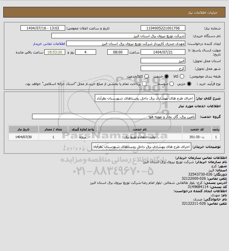 استعلام اجرای طرح های بهسازی برق داخل روستاهای شهرستان نظرآباد, استعلام اجرای طرح های بهسازی برق داخل روستاهای شهرستان نظرآباد