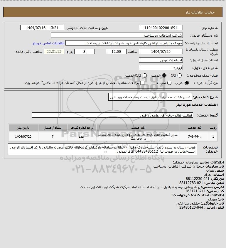 شرح کلی نیاز: تعمیر هفت عدد یونیت طبق لیست ومشخصات پیوستی