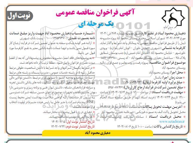 دهیاری محمودآباد در نظر دارد طبق مصوبه شماره 289/ ش / 1404 مورخ 1404.6.24 شورای اسلامی محترم روستای محمود آباد پروژه مشروحه ذیل را از طریق فراخوان مناقصه عمومی به پیمانکار واجد شرایط واگذار نماید.
