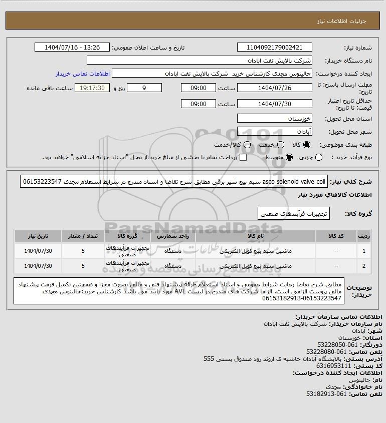 استعلام asco solenoid valve coil سیم پیچ شیر برقی مطابق شرح تقاضا و اسناد مندرج در شرایط استعلام محمدی 06153223547, استعلام asco solenoid valve coil سیم پیچ شیر برقی مطابق شرح تقاضا و اسناد مندرج در شرایط استعلام محمدی 06153223547