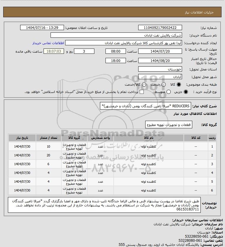 استعلام REDUCERS *صرفا تامین کنندگان بومی (آبادان و خرمشهر)*, استعلام REDUCERS *صرفا تامین کنندگان بومی (آبادان و خرمشهر)*