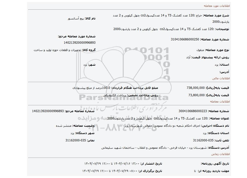 | عنوان معامله: :120 عدد کفشک T5 و 14 عددکپسولco2 چهل کیلویی و 2 عدد پارشوت2000 | ||