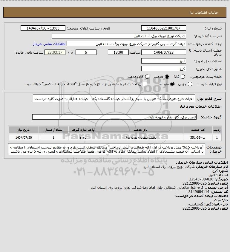 استعلام بها و موضوع استعلام استعلام اجرای طرح تعویض شبکه هوایی با سیم روکشدار خیابان گلستان یکم - خیابان چناران به صورت کلید دردست به اطلاع کلیه شرکتها و افراد متخصص واجد شرایط میرساند، آگهی گذار در نظر دارد از طریق استعلام بها، نسبت به انتخاب و دریافت پیشنهادات اقدام نماید. این استعلام با کد آگهی ثبت شده در سامانه خبرگزاری پارس نماد : 9668184 منتشر شده است. مشخصات استعلام : تاریخ شروع استعلام: 1404/07/16 آخرین مهلت ارسال پیشنهاد قیمت : 1404/07/23 و محل اجرای پروژه : استان البرز میباشد. استعلام قیمت مورد درخواست : استعلام اجرای طرح تعویض شبکه هوایی با سیم روکشدار خیابان گلستان یکم - خیابان چناران به صورت کلید دردست با دستهبندیهای تخصصی و گروه های مرتبط : پیمانکاری برق و الکترونیک, استعلام اطلاع رسانی میگردد.