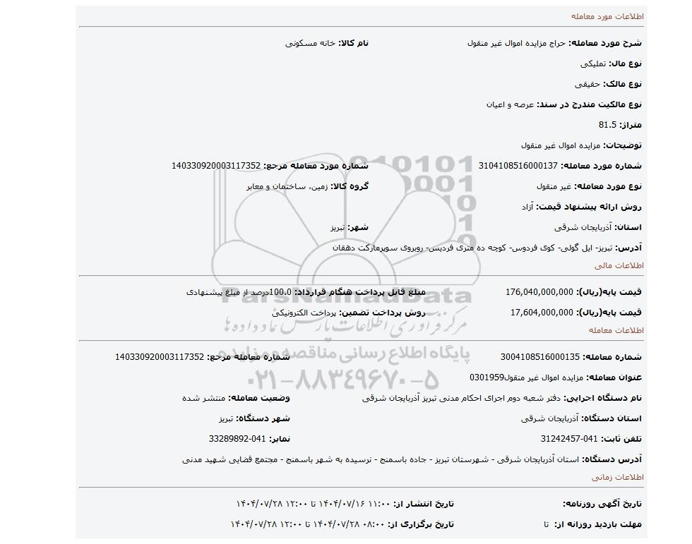 عنوان معامله: مزایده اموال غیر منقول0301959
