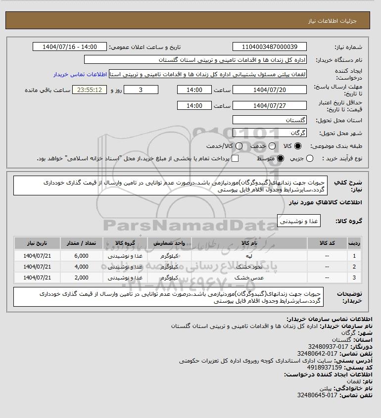 شرح کلی نیاز: حبوبات جهت زندانهای(گنبدوگرگان)موردنیازمی باشد،درصورت عدم توانایی در تامین وارسال از قیمت گذاری خودداری گردد،سایرشرایط وجدول اقلام فایل پیوستی