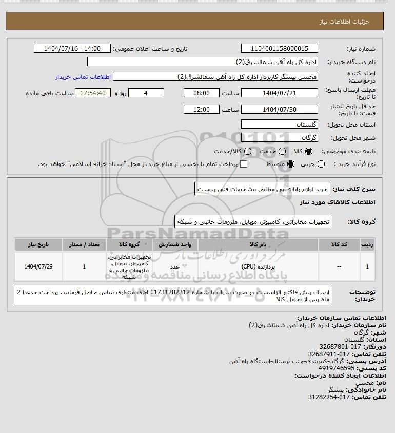 | 1 | -- | پردازنده (CPU) | عدد | تجهیزات مخابراتی، کامپیوتر، موبایل، ملزومات جانبی و شبکه | 1 | 1404/07/29 |