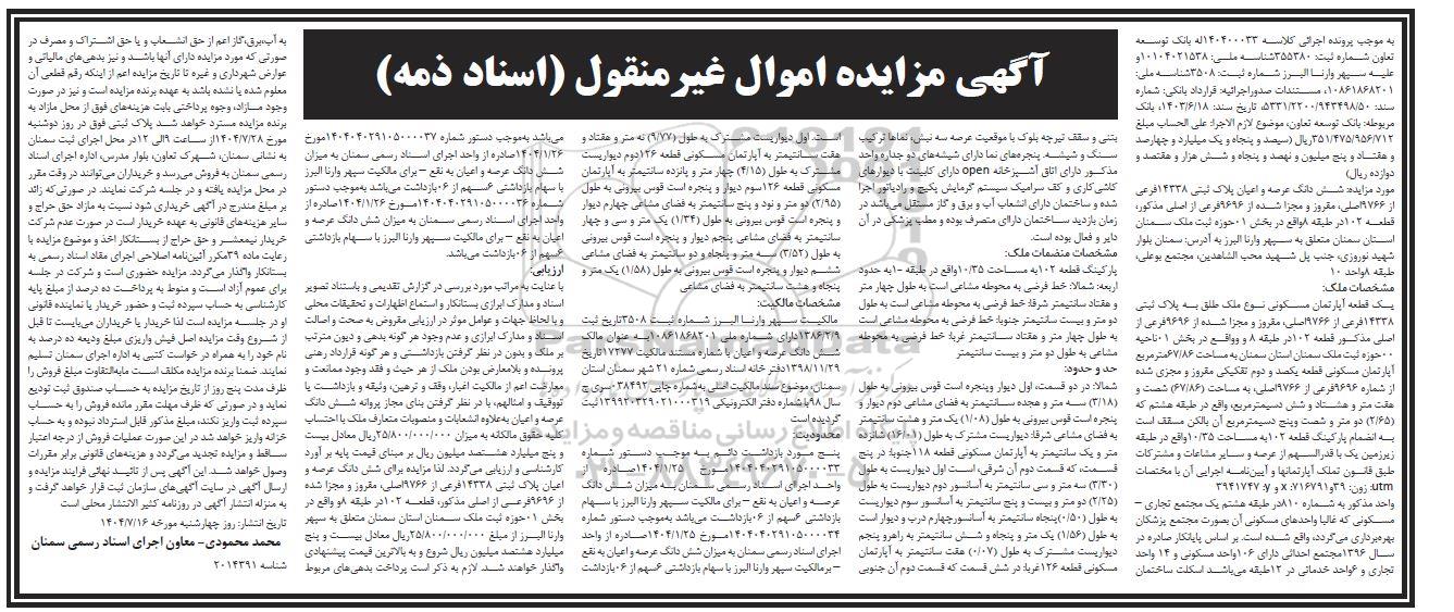 تاریخ مزایده 1404.07.28 ساعت 9 الی 12 روز 2شنبه در محل اجرای ثبت سمنان به نشانی سمنان، شهرک تعاون، بلوار مدرس، اداره اجرای اسناد رسمی سمنان