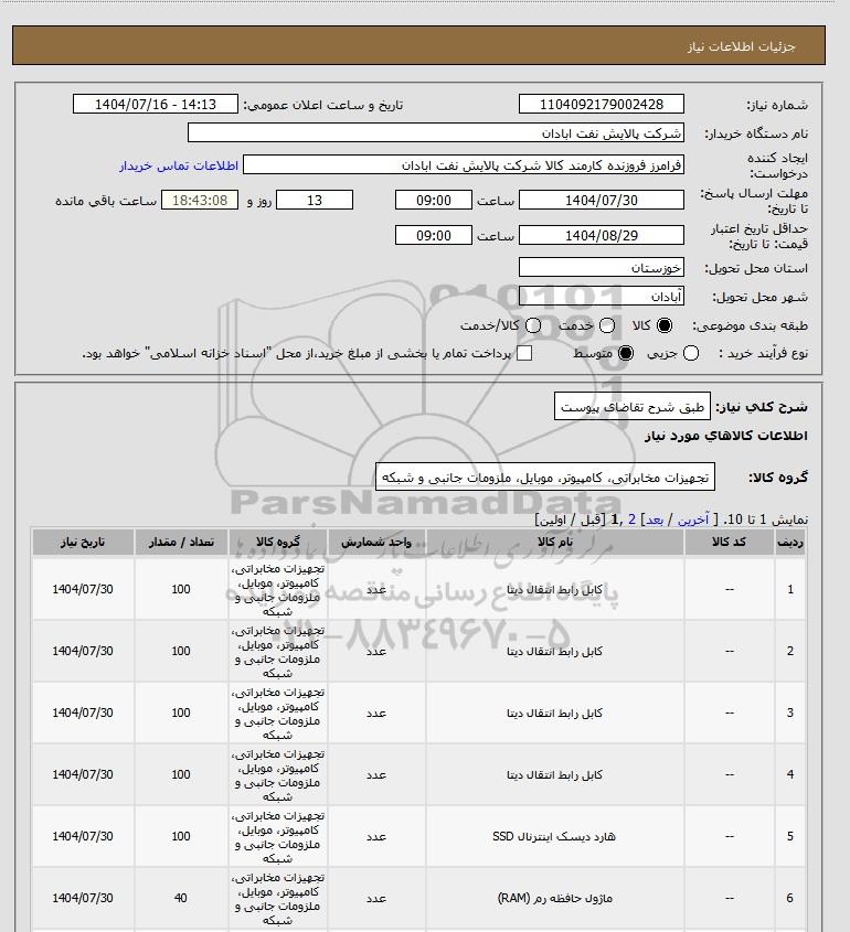 | 7 | -- | کابل رابط انتقال دیتا | عدد | تجهیزات مخابراتی، کامپیوتر، موبایل، ملزومات جانبی و شبکه | 100 | 1404/07/30 |