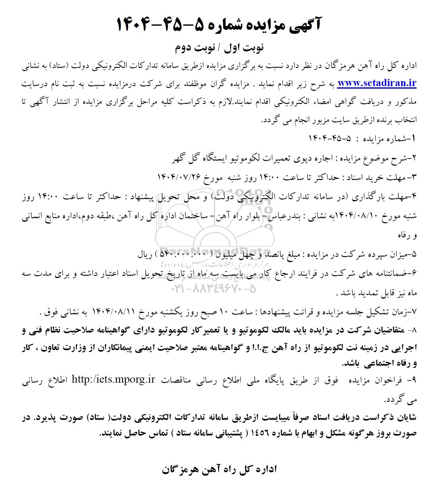 اداره کل راه آهن هرمزگان در نظر دارد نسبت به برگزاری مزایده از طریق سامانه تدارکات الکترونیکی دولت (ستاد) به نشانی ستاد ایران به شرح زیر اقدام نماید. مزایده گران موظفند برای شرکت در مزایده نسبت به ثبت نام در سایت مذکور و دریافت گواهی امضاء الکترونیکی اقدام نمایند. لازم به ذکر است کلیه مراحل برگزاری مزایده از انتشار آگهی تا انتخاب برنده از طریق سایت مزبور انجام می گردد.