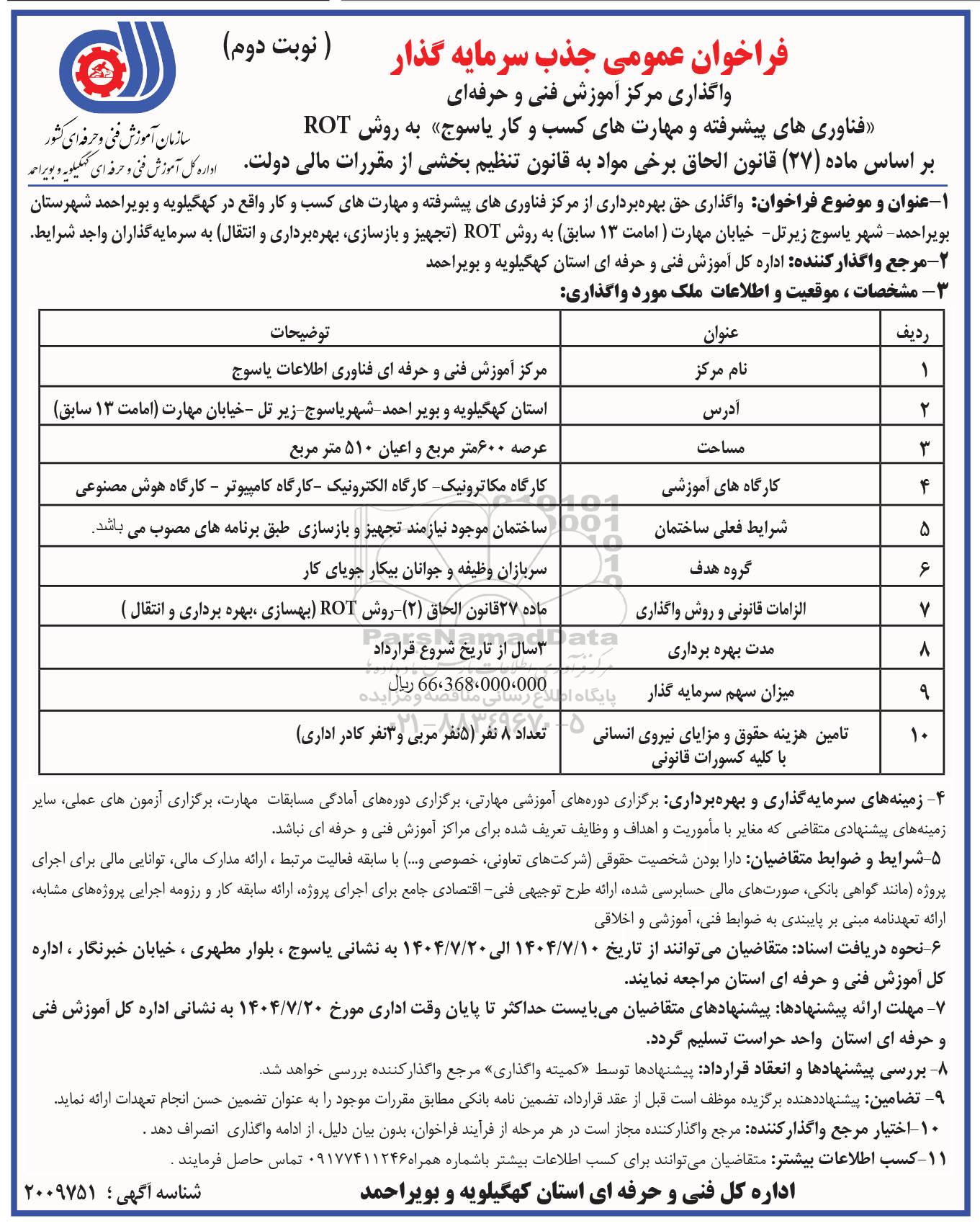 واگذاری مرکز آموزش فنی و حرفه ای (فناوری های پیشرفته و مهارت های کسب و کار یاسوج) به روش ROT بر اساس ماده (27) قانون الحاق برخی مواد به قانون تنظیم بخشی از مقررات مالی دولت