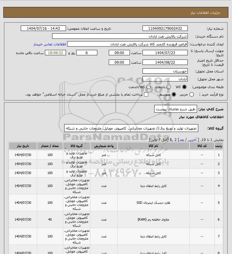 | 9 | -- | کابل رابط انتقال دیتا | عدد | تجهیزات مخابراتی، کامپیوتر، موبایل، ملزومات جانبی و شبکه | 20 | 1404/07/30 |