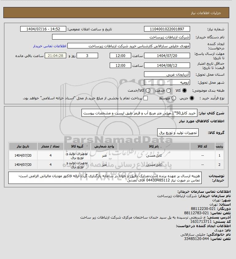 شرح کلی نیاز: خرید کابل50*1 میلی متر مربع آب و قرمز طبق لیست و مشخصات پیوست