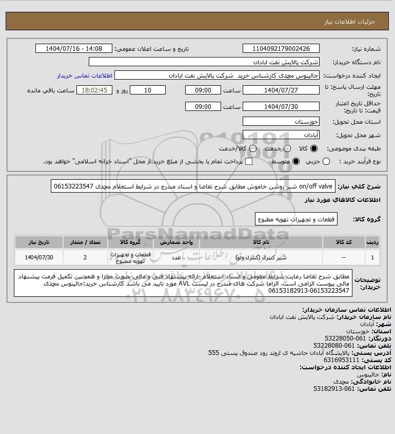 شرح کلی نیاز: on/off valve شیر روشن خاموش مطابق شرح تقاضا و اسناد مندرج در شرایط استعلام محمدی 06153223547
