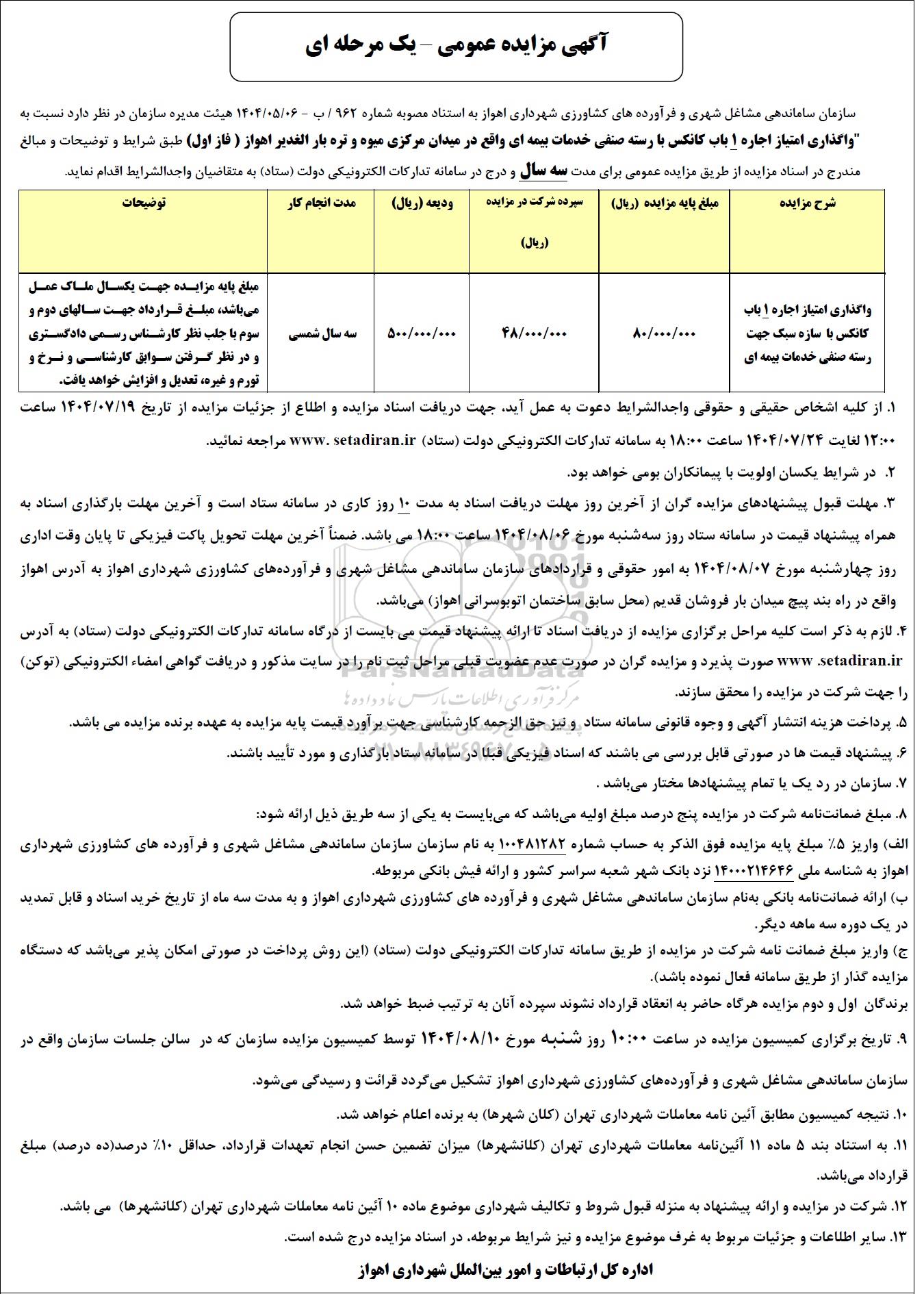 سازمان ساماندهی مشاغل شهری و فرآورده های کشاورزی شهرداری اهواز به استناد مصوبه شماره 962 . ب - 1404.05.06 هیئت مدیره سازمان در نظر دارد نسبت به واگذاری امتیاز اجاره 1 باب کانکس با رسته صنفی خدمات بیمه ای واقع در میدان مرکزی میوه و تره بار الغدیر اهواز (فاز اول طبق شرایط و توضیحات و مبالغ مندرج در اسناد مزایده از طریق مزایده عمومی برای مدت سه سال و درج در سامانه تدارکات الکترونیکی دولت (ستاد) به متقاضیان واجد الشرایط اقدام نماید.
