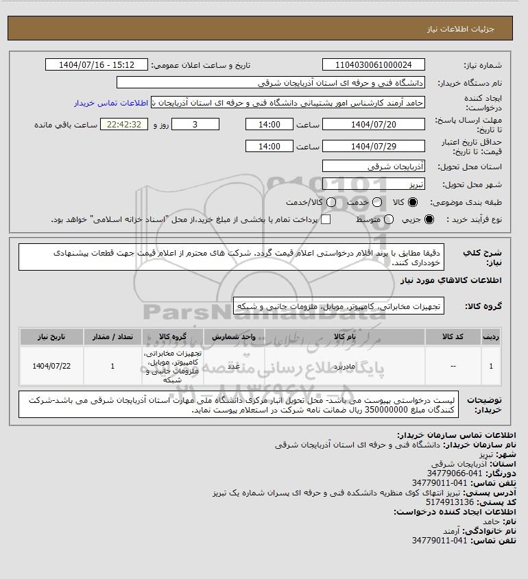 نام دستگاه خریدار:دانشگاه فنی و حرفه ای استان آذربایجان شرقی