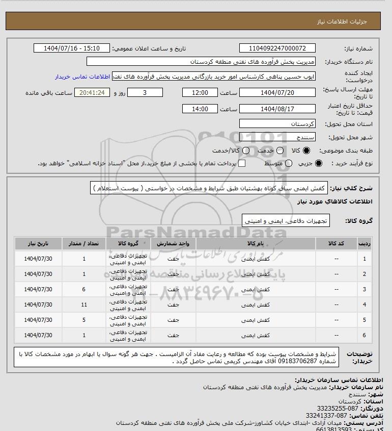 | 6 | -- | کفش ایمنی | جفت | تجهیزات دفاعی، ایمنی و امنیتی | 1 | 1404/07/30 |