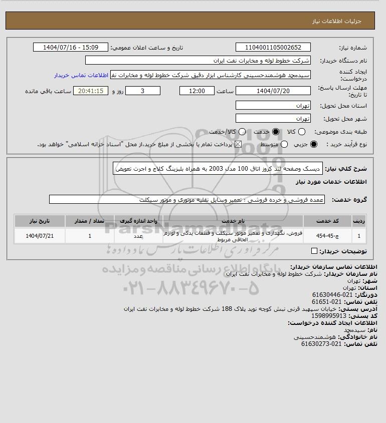 شرح کلی نیاز: دیسک وصفحه لند کروز اتاق 100 مدل 2003 به همراه بلبزینگ کلاج و اجرت تعویض