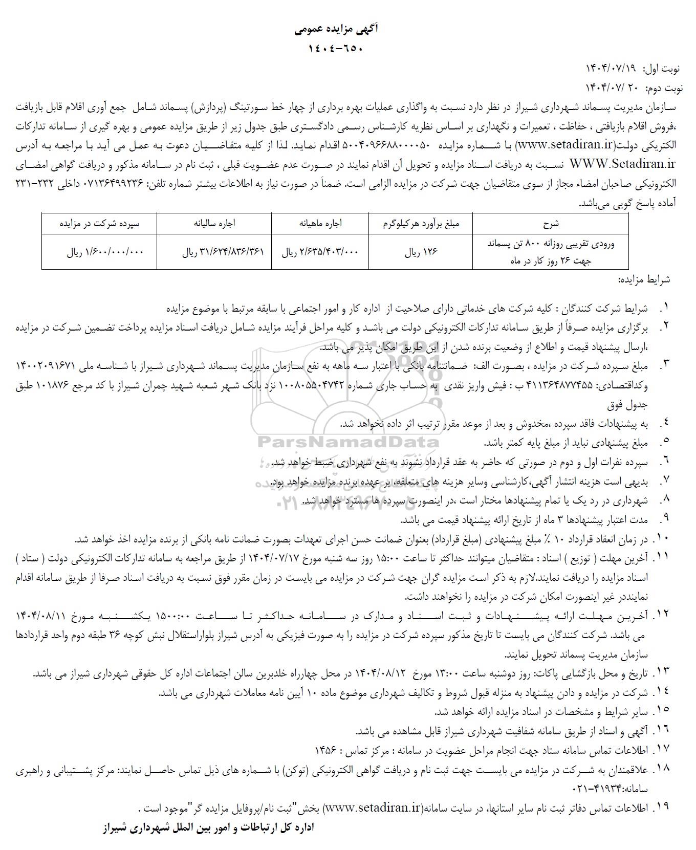 سازمان مدیریت پسماند شهرداری شیراز در نظر دارد نسبت به واگذاری عملیات بهره برداری از چهار خط سورتینگ (پردازش) پسماند شامل جمع آوری اقلام قابل بازیافت ، فروش اقلام بازیافتی، حفاظت، تعمیرات و نگهداری بر اساس نظریه کارشناس رسمی دادگستری طبق جدول زیر از طریق مزایده عمومی و بهره گیری از سامانه تدارکات الکتریکی دولت ستاد ایران با شماره مزایده 5004096688000050 اقدام نماید. لذا از کلیه متقاضیان دعوت به عمل می آید با مراجعه به آدرس ستاد ایران نسبت به دریافت اسناد مزایده و تحویل آن اقدام نمایند در صورت عدم عضویت قبلی ، ثبت نام در سامانه مذکور و دریافت گواهی امضای الکترونیکی صاحبان امضاء مجاز از سوی متقاضیان جهت شرکت در مزایده الزامی است. ضمنا در صورت نیاز به اطلاعات بیشتر