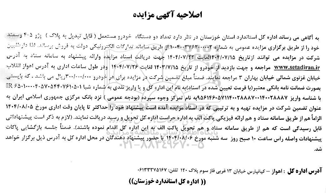 به آگاهی می رساند اداره کل استاندارد استان خوزستان در نظر دارد تعداد دو دستگاه خودرو مستعمل (قابل تبدیل به پلاک ) پژو 405 و سمند خود را از طریق برگزاری مزایده عمومی به شماره 1004003762000002 از طریق سامانه تدارکات الکترونیکی دولت به فروش برساند. لذا دار طلبین شرکت در مزایده می توانند از تاریخ 1404.07.15 لغایت 1404.07.22 جهت دریافت اسناد مزایده وارائه پیشنهاد به سامانه ستاد به آدرس ستاد ایران مراجعه و جهت بازدید از خودرو از تاریخ 1403.7.15 لغایت 1404.07.26 و در طول ساعات اداری به آدرس اهواز انقلاب خیابان غزنوی شمالی خیابان بهاران 3 مراجعه نمایند. ضمناً مبلغ تضمین شرکت در مزایده برای هر خودرو 300.000.000 ریال می باشد، که بایستی بصورت ضمانت نامه بانکی معتبر( با فرمت تعیین شده در اسناد) به نام این اداره کل و یا واریز نقدی به شماره شبا 650100004057054407610501 IR با شناسه واریز 956146057114002888700140028887 به نام تمرکز وجوه سپرده (بودجه عمومی) نزد بانک مرکزی جمهوری اسلامی ایران به عنوان تضمین شرکت در مزایده تهیه و به ترتیبی که در اسناد مزایده آمده است پیشنهاد خود را حداکثر تا پایان وقت اداری مورخ 1404.08.05 الزاماً هم از طریق سامانه ستاد و هم ارائه فیزیکی پاکت الف به اداره حراست اداره کل تحویل و رسید دریافت نمایند. (لازم به ذکر است پیشنهاداتی قابل رسیدگی است که هم از طریق سامانه ستاد و هم تحویل پاکت الف به این اداره کل اقدام نموده باشند ). ضمناً جلسه بازگشایی پاکات پیشنهادات واصله راس ساعت 10 صبح روز سه شنبه مورخ 1404.08.06 با حضور پیشنهاد دهندگان در محل اداره کل به آدرس ذیل برگزار خواهد شد.