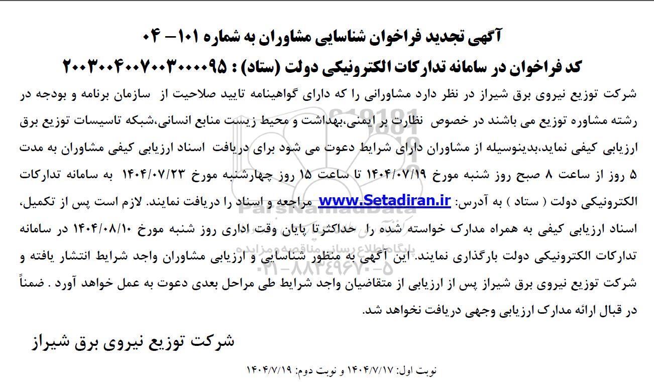 آگهی تجدید فراخوان شناسایی مشاوران به شماره 101- 04