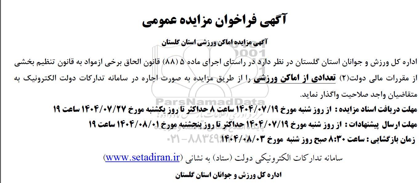 اداره کل ورزش و جوانان استان گلستان در نظر دارد در راستای اجرای ماده 5 (88) قانون الحاق برخی از مواد به قانون تنظیم بخشی از مقررات مالی دولت (2) تعدادی از اماکن ورزشی را از طریق مزایده به صورت اجاره در سامانه تدارکات دولت الکترونیک به متقاضیان واجد صلاحیت واگذار نماید.