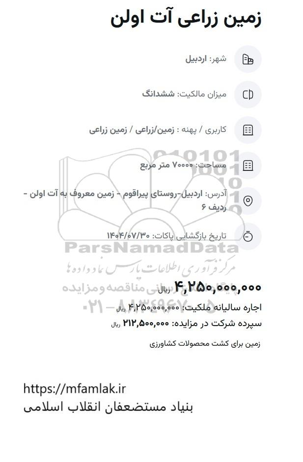 مزایده عمومی مزایده زمین زراعی آت اولن برگزار میگردد. از کلیه افراد متخصص و شرکتهای واجد شرایط دعوت به عمل میآید تا در این مزایده با کد خبرگزاری پارس نماد : 9669032 شرکت نمایند تاریخ شروع مزایده : 1404/07/16 مهلت شرکت در مزایده: تا پایان روز 1404/07/30 مکان برگزاری اموال واگذاری استانهای تهران و دستهبندیهای مربوط به این حراجی ماشین آلات و تجهیزات کشاورزی و دام پروری, املاک و زمین میباشد.