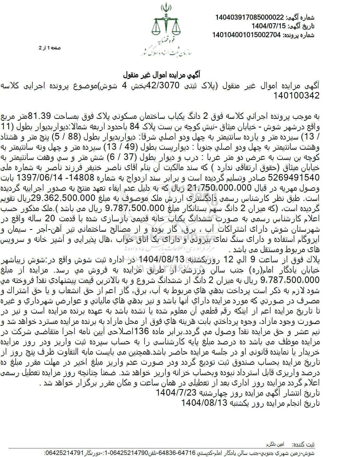 آگهی مزایده اموال غیر منقول پلاک ثبتی 42.3070 بخش 4 (شوش) موضوع پرونده اجرایی کلاسه 140100342