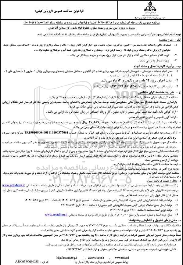 مناقصه عمومی یک مرحله ای شماره م م آج 1404/0092 (شماره فراخوان ثبت شده در سامانه ستاد 2004093228000384)