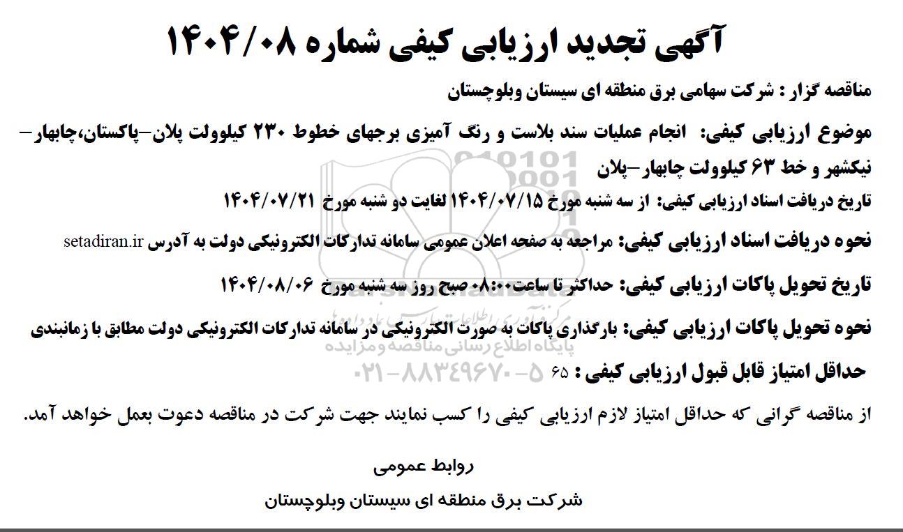 موضوع ارزیابی کیفی: انجام عملیات سند بلاست و رنگ آمیزی برجهای خطوط 230 کیلوولت پلان - پاکستان، چابهار- نیکشهر و خط 63 کیلوولت چابهار - پلان