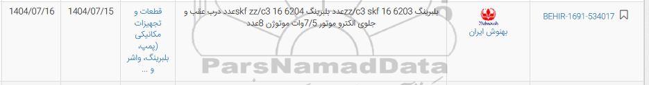 | BEHIR-1691-534017 | بهنوش ایران | بلبرینگ 16.6203 zz/c3 skf عدد بلبرینگ 16 6204 zz-c3 عدد درب عقب و جلوی الکترو موتور 7.5 وات موتوژن 8 عدد | قطعات و تجهیزات مکانیکی (پمپ، بلبرینگ، واشر و...) | 1404.07.15 | 1404.07.16 |