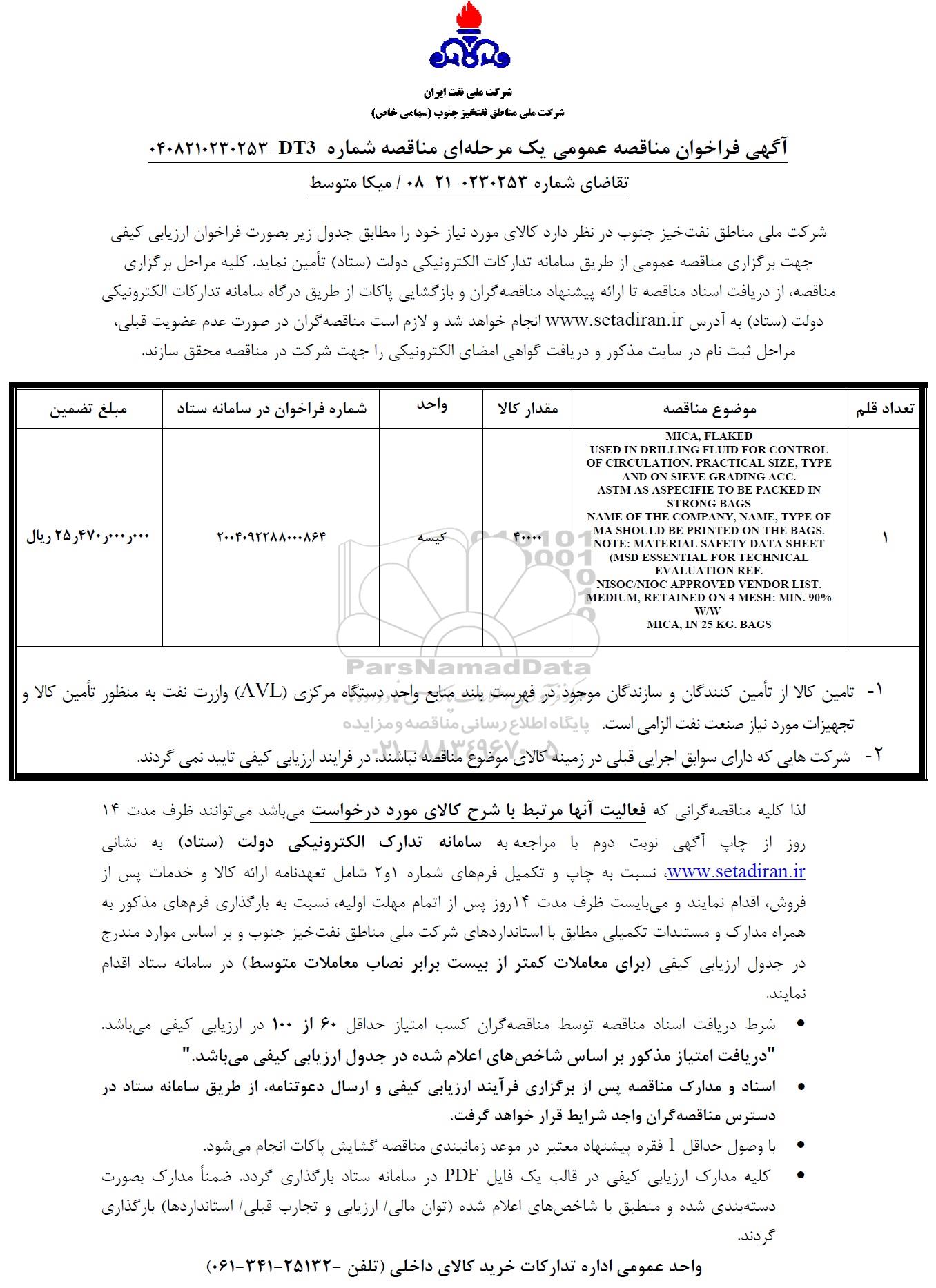 شرکت ملی مناطق نفتخیز جنوب در نظر دارد کالای مورد نیاز خود را مطابق جدول زیر بصورت فراخوان ارزیابی کیفی جهت برگزاری مناقصه عمومی از طریق سامانه تدارکات الکترونیکی دولت (ستاد) تأمین نماید. کلیه مراحل برگزاری مناقصه از دریافت اسناد مناقصه تا ارائه پیشنهاد مناقصه گران و بازگشایی پاکات از طریق درگاه سامانه تدارکات الکترونیکی دولت (ستاد) به آدرس ستاد ایران انجام خواهد شد و لازم است مناقصه گران در صورت عدم عضویت قبلی، مراحل ثبت نام در سایت مذکور و دریافت گواهی امضای الکترونیکی را جهت شرکت در مناقصه محقق سازند.