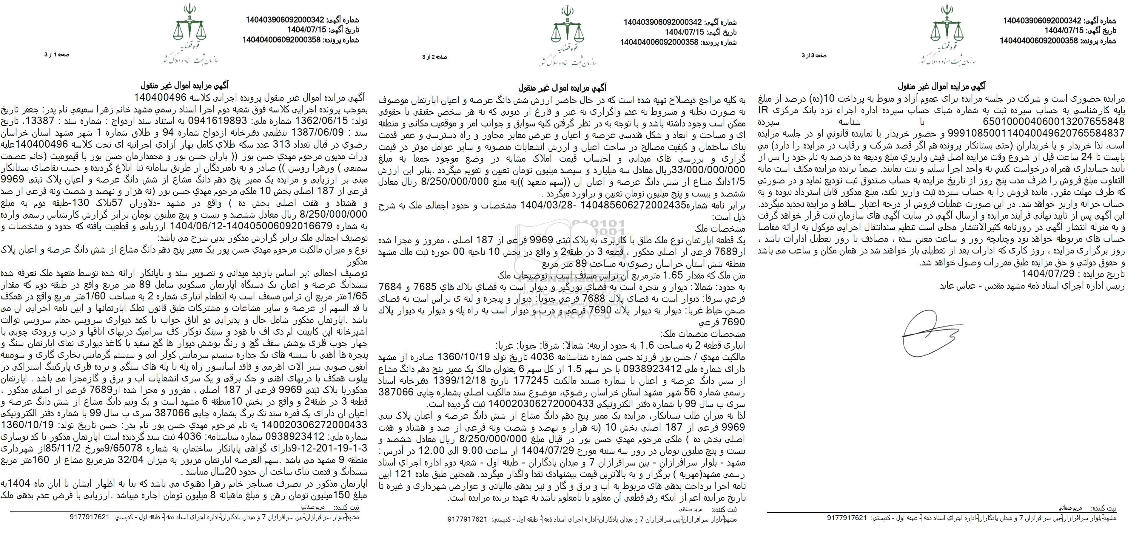 تاریخ مزایده 1404.7.29 از ساعت9 الی 12 در آدرس مشهد بلوار سرافرازان بین سرافرازان 7 و میدان یادگاران طبقه اول شعبه دوم اداره اجرای اسناد رسمی