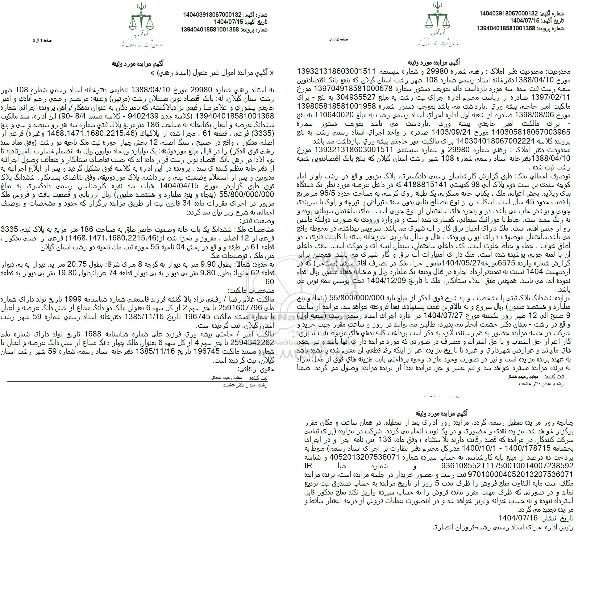 تاریخ مزایده 1404.7.27 در اداره اجرای اسناد رسمی رشت به آدرس رشت میدان دکتر حشمت