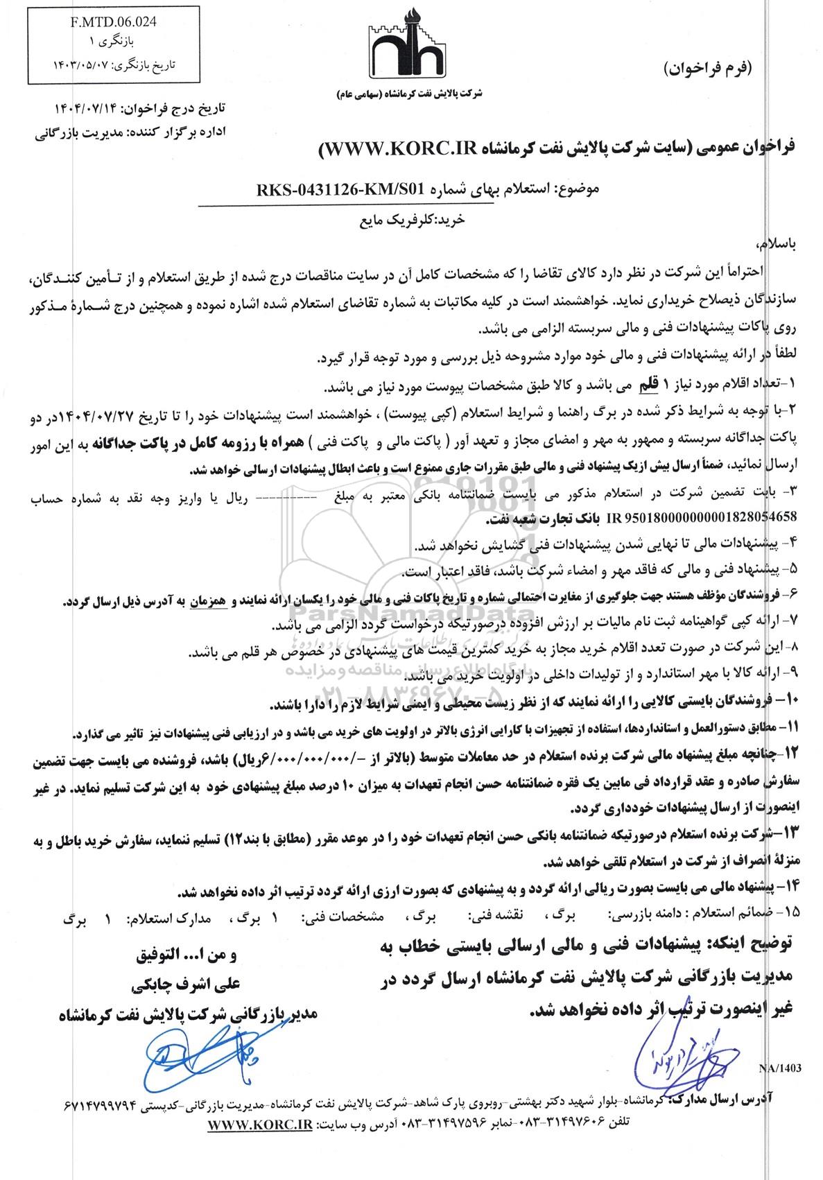 موضوع: استعلام بهای شماره RKS-0431126-KM/S01