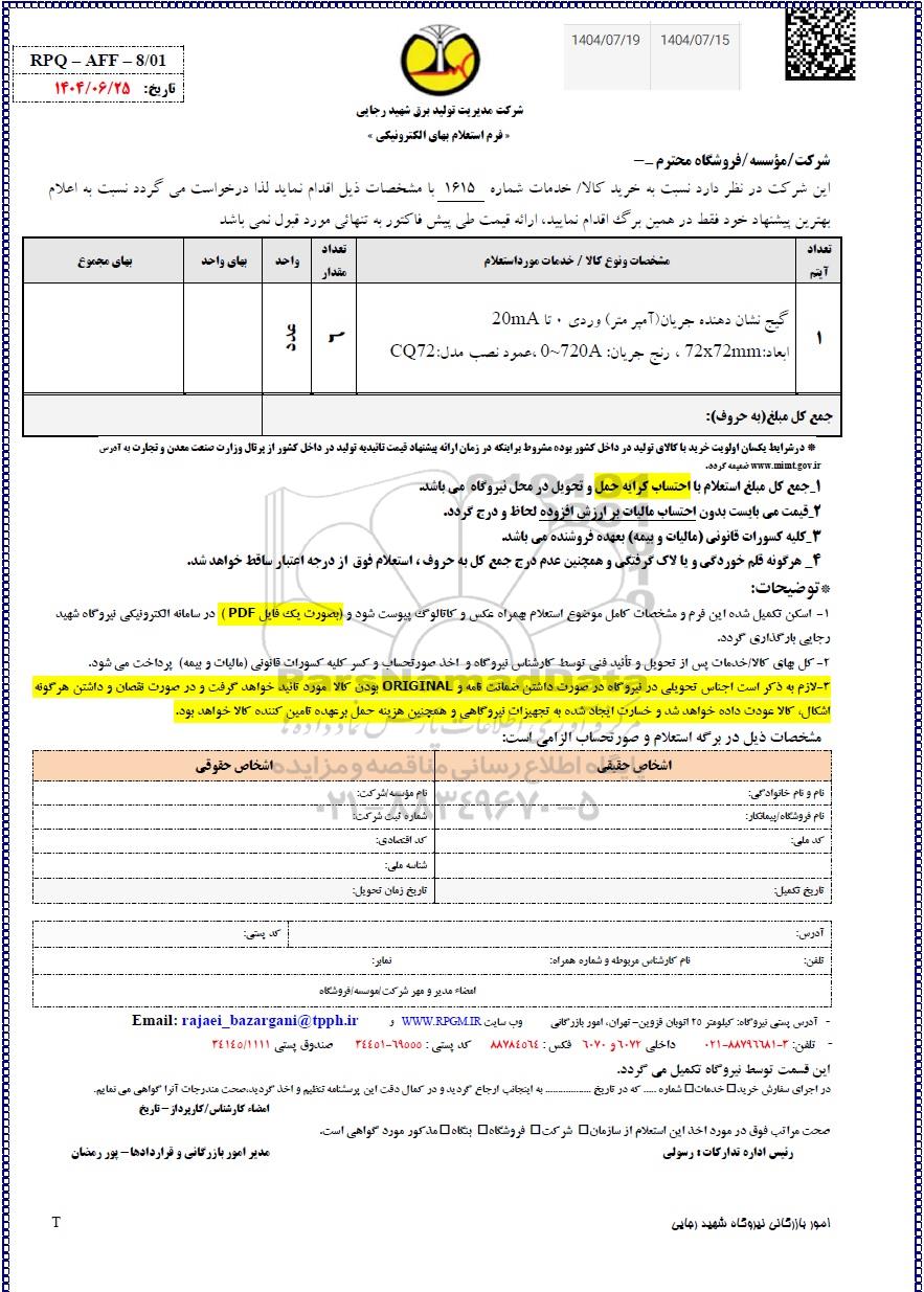 1- اسکن تکمیل شده این فرم و مشخصات کامل موضوع استعلام بهمراه عکس و کاتالوگ پیوست شود و بصورت یک فایل (PDF) در سامانه الکترونیکی نیروگاه شهید رجایی بارگذاری گردد.