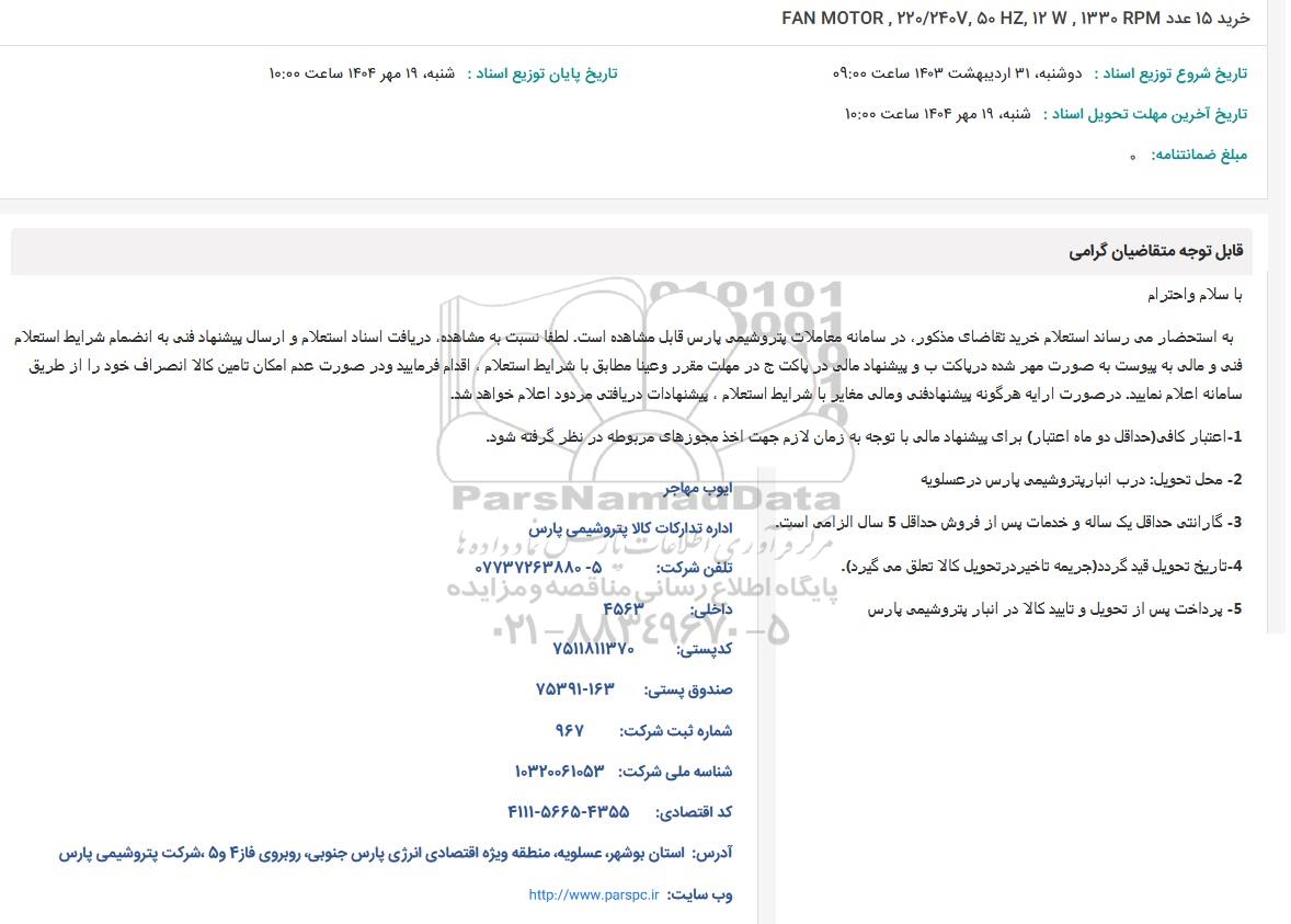 به استحضار میرساند استعلام خرید تقاضای مذکور در سامانه معاملات پتروشیمی پارس قابل مشاهده است. لطفا نسبت به مشاهده دریافت استاد استعلام و ارسال پیشنهاد فنی به انضمام شرایط استعلام فنی مالی به پیوست به صورت مهر شده در پاکت ب و پیشنهاد مالی در پاکت ج در مهلت مقرر و عينا مطابق با شرایط استعلام، اقدام فرمایید و در صورت عدم امکان تامین کالا انصراف خود را از طریق سامانه اعلام نمایی در صورت ارایه هرگونه پیشنهاد فنی و مالی مغایر با شرایط استعلام ، پیشنهادات دریافتی مردود اعلام خواهد شد.