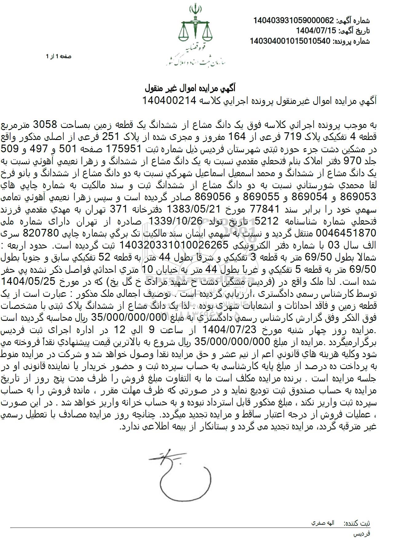 مزایده یک دانگ مشاع از ششدانگ یک قطعه زمین بمساحت 3058 متر مربع قطعه 4 تفکیکی پلاک 719 فرعی از 164 , مزایده یک دانگ مشاع از ششدانگ یک قطعه زمین بمساحت 3058 متر مربع قطعه 4 تفکیکی پلاک 719 فرعی از 164