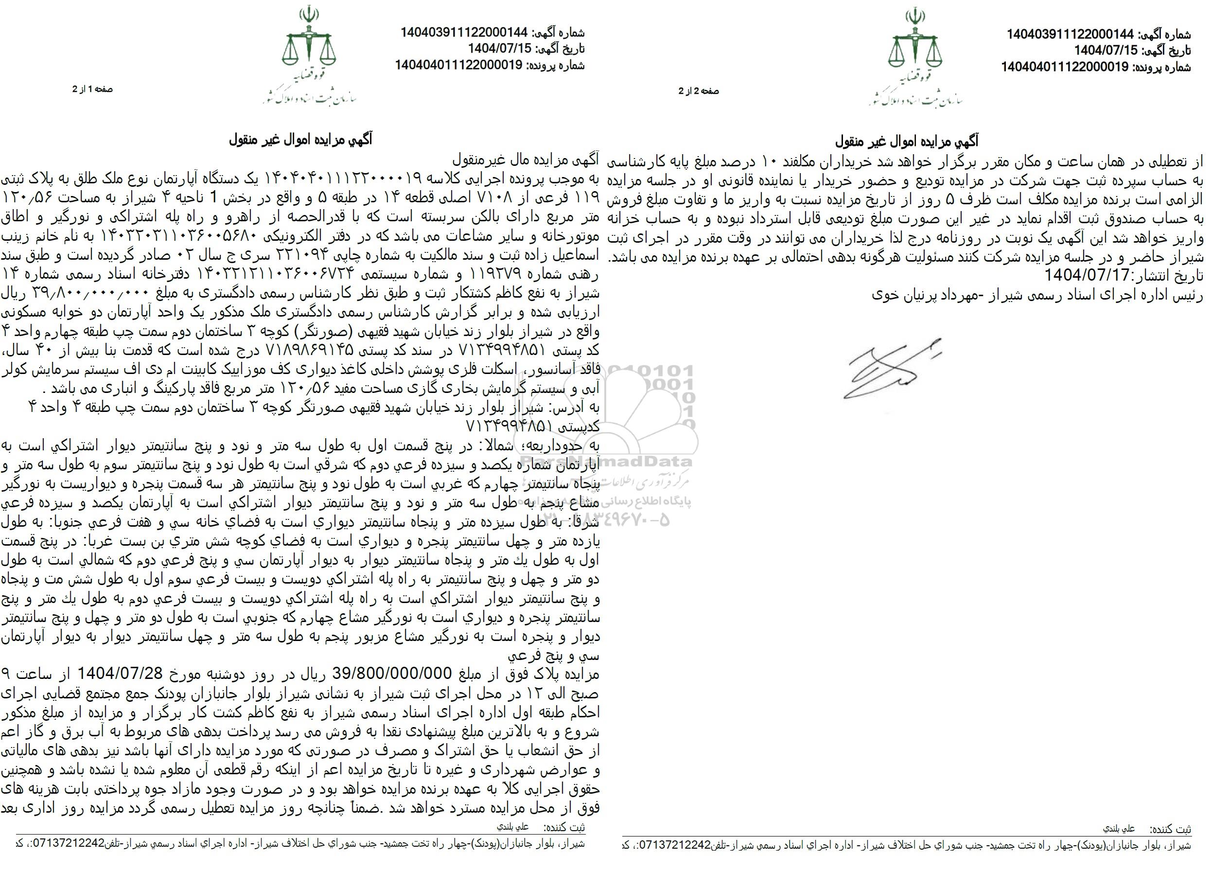 به موجب پرونده اجرایی کلاسه 140404011132000019 یک دستگاه آپارتمان نوع ملک طلق به پلاک ثبتی 119 فرعی از 7108 اصلی قطعه 14 در طبقه 5 و واقع در بخش 1 ناحیه 4 شیراز به مساحت 130٫56 متر مربع دارای بالکن سربسته است که با قدر الحصه از راهرو و راه پله اشتراکی و نورگیر و اطاق موتورخانه و سایر مشاعات میباشد که در دفتر الکترونیکی 140330311036005680 به نام خانم زینب اسماعیل زاده ثبت و سند مالکیت به شماره چایی 221094 سری ج سال 02 صادر گردیده است و طبق سند رفنی شماره 119379 و شماره سیستمی 140331311036006734 دفترخانه اسناد رسمی شماره 14 شیراز به نفع کاظم کشتکار ثبت و طبق نظر کارشناس رسمی دادگستری به مبلغ 39.800.000.000 ریال ارزیابی شده و برابر گزارش کارشناس رسمی دادگستری ملک مذکور یک واحد آپارتمان دو خوابه مسکونی واقع در شیراز بلوار رند خیابان شهید فقیهی (صورتگر) کوچه 3 ساختمان دوم سمت چپ طبقه چهارم واحد 4 کد پستی 7134994851 در سند کد پستی 7189869145 درج شده است که قدمت بنا بیش از 40 سال فاقد آسانسور اسکلت فلزی پوشش داخلی کاغذ دیواری کف موزاییک کابینت ام دی اف سیستم سرمایش کولر ابی و سیستم گرمایش بخاری گازی مساحت مفید 120.56 متر مربع فاقد پارکینگ و انباری می باشد. به آدرس شیراز بلوار رند خیابان شهید فقیهی صورتگر کوچه 3 ساختمان دوم سمت چپ طبقه 4 واحد 4