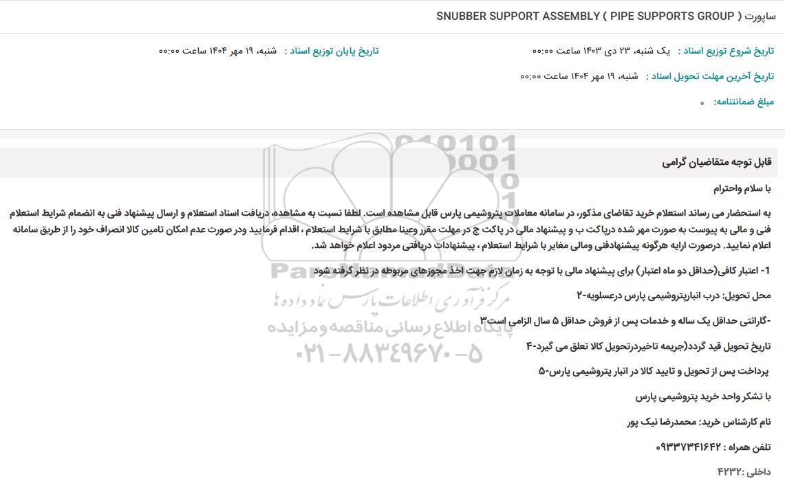 استعلام بها و موضوع استعلام ساپورت SNUBBER SUPPORT ASSEMBLY (PIPE SUPPORTS GROUP ) به اطلاع کلیه شرکتها و افراد متخصص واجد شرایط میرساند، آگهی گذار در نظر دارد از طریق استعلام بها، نسبت به انتخاب و دریافت پیشنهادات اقدام نماید. این استعلام با کد آگهی ثبت شده در سامانه خبرگزاری پارس نماد : 9669110 منتشر شده است. مشخصات استعلام : تاریخ شروع استعلام: 1404/07/16 آخرین مهلت ارسال پیشنهاد قیمت : 1404/07/19 و محل اجرای پروژه : استان بوشهر میباشد. استعلام قیمت مورد درخواست : ساپورت SNUBBER SUPPORT ASSEMBLY (PIPE SUPPORTS GROUP ) با دستهبندیهای تخصصی و گروه های مرتبط : سازه های فلزی و فضایی, لوله و اتصالات, تجهیزات نفت و گاز, تجهیزات و ماشین آلات صنعتی, استعلام اطلاع رسانی میگردد.