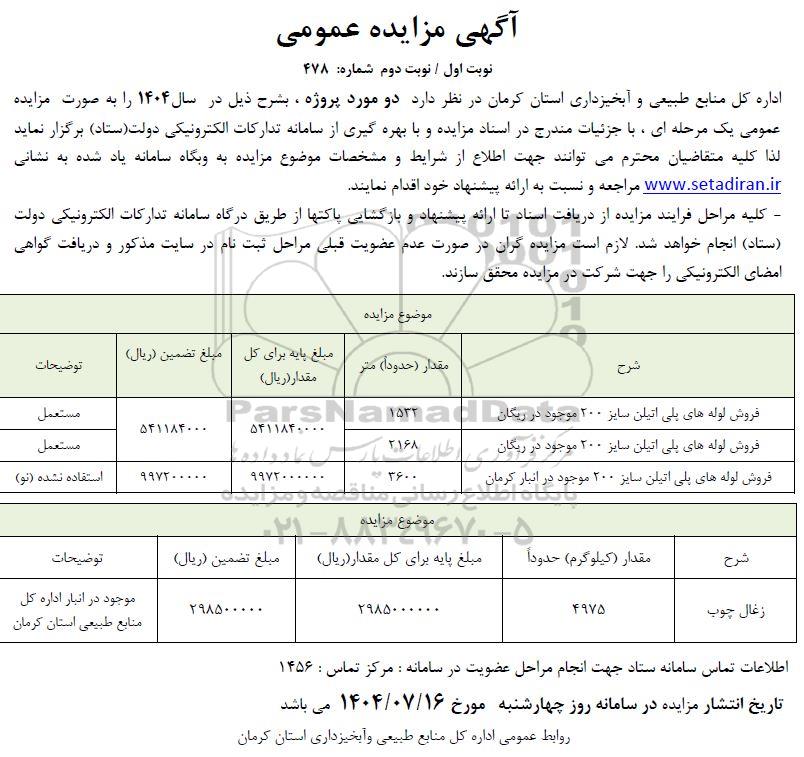 اداره کل منابع طبیعی و آبخیزداری استان کرمان در نظر دارد دو مورد پروژه، بشرح ذیل در سال 1404 را به صورت مزایده عمومی یک مرحله ای، با جزئیات مندرج در اسناد مزایده و با بهره گیری از سامانه تدارکات الکترونیکی دولت (ستاد) برگزار نماید . لذا کلیه متقاضیان محترم می توانند جهت اطلاع از شرایط و مشخصات موضوع مزایده به وبگاه سامانه یاد شده به نشانی ستاد ایران مراجعه و نسبت به ارائه پیشنهاد خود اقدام نمایند.